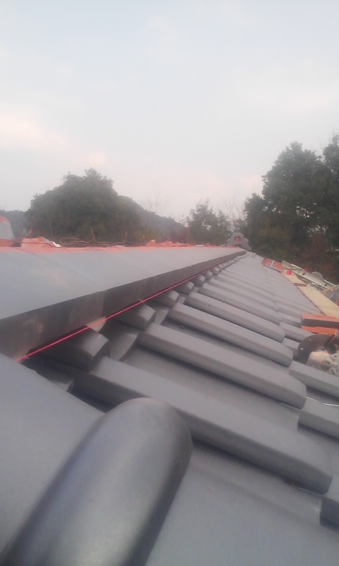 先ずは、大棟から 水糸に合わせて、のしを並べていきます。 ここが一番肝心なんで、特に時間をかけて作業をします 一段目がキッチリ出来ていれば、後の作業がラクに進むんで