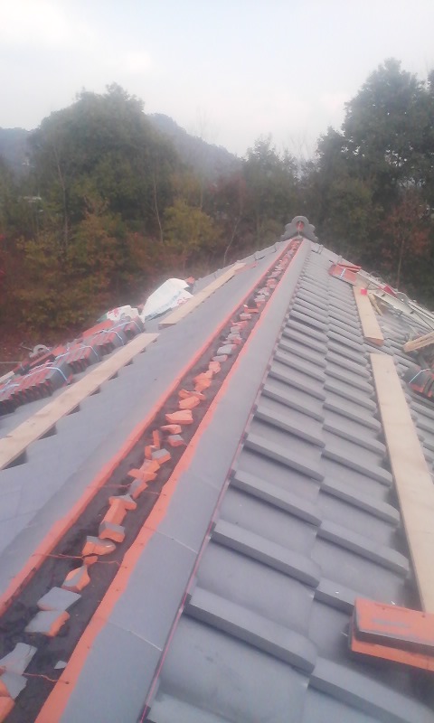 最近の天候の悪さから、下屋根の瓦降ろしも進まないので とりあえず大屋根を、先に片付けようと、のし積みを始めました